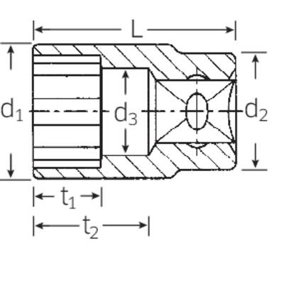 Műszaki adatok: Anyag: HPQ nagyteljeítményű acél · Anyagjellemző: Krómozott · DIN szabvány: DIN 3124, DIN ISO 2725-1 · Elhajtás: Külső hatlap · Kulcsszélesség: 11 mm · Meghajtás (csavarhúzó): 3/8" (10 mm) · Méret, hossz: 27 mm · Termék típus: Dugókulcs betét · További műszaki adatok: d1: 15,6 mm · d2: 16,5 mm · t1 8,5 mm · t2: 13,7 mm · d3: 10 mm